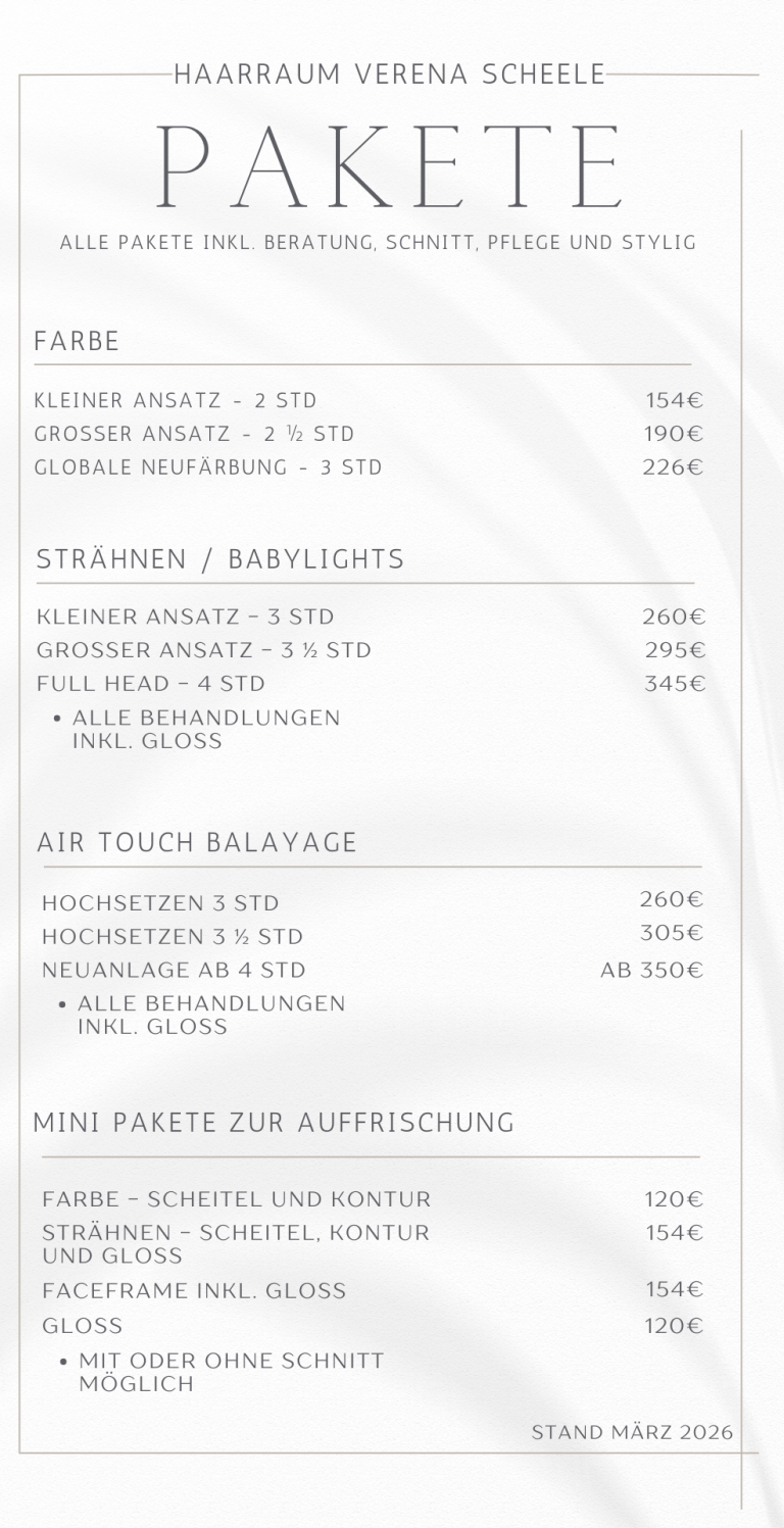 Unsere All-Inclusive-Pakete beinhalten neben Beratung, Schnitt und Styling auch sämtliche Materialien, die wir verwenden – ohne zusätzliche Kosten. So kannst du dich ganz entspannt auf dein individuelles Ergebnis freuen.