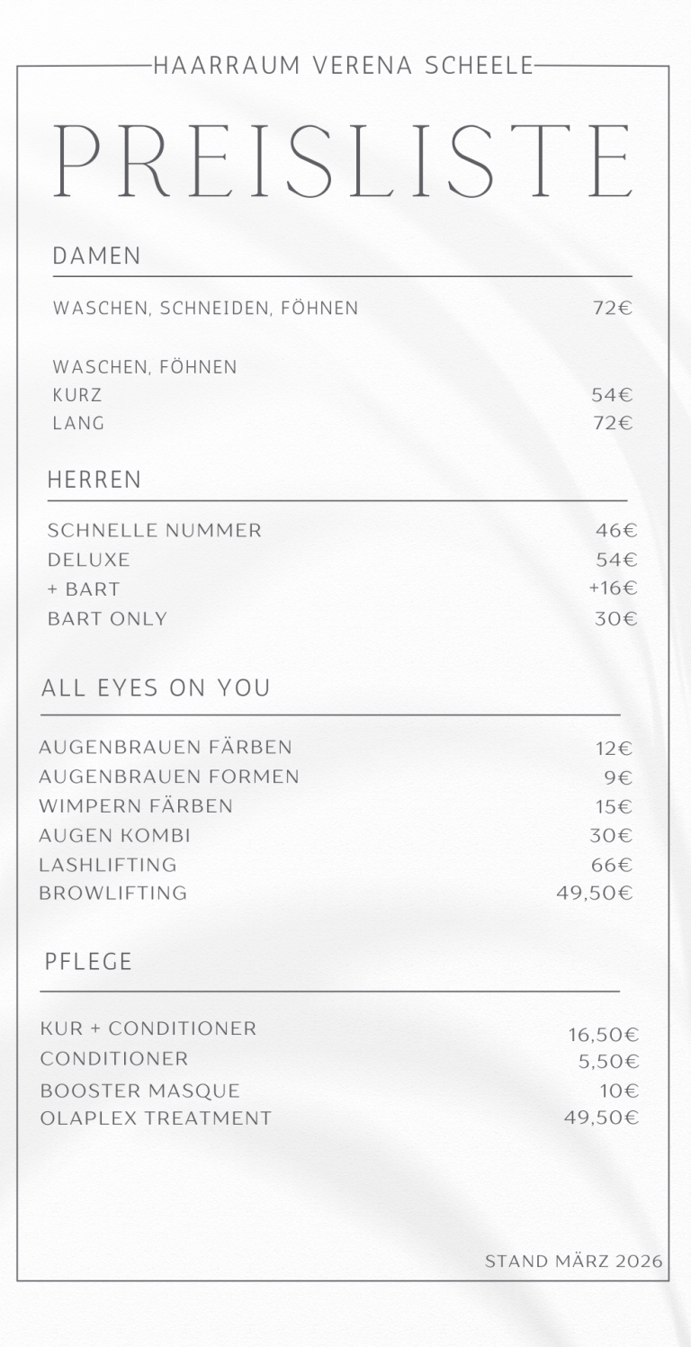 Bei uns stehen ehrliche Beratung, hochwertige Qualität und handwerkliche Präzision an erster Stelle – damit du dich jederzeit wohl und gut aufgehoben fühlst. Unsere Preise orientieren sich an der Dauer der Behandlung sowie dem eingesetzten Material. So gewährleisten wir Transparenz und Fairness für jeden Kunden.